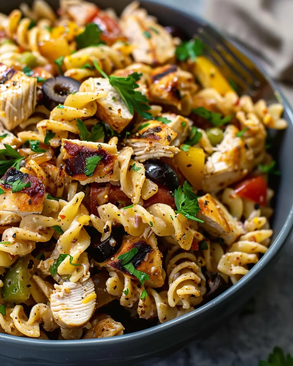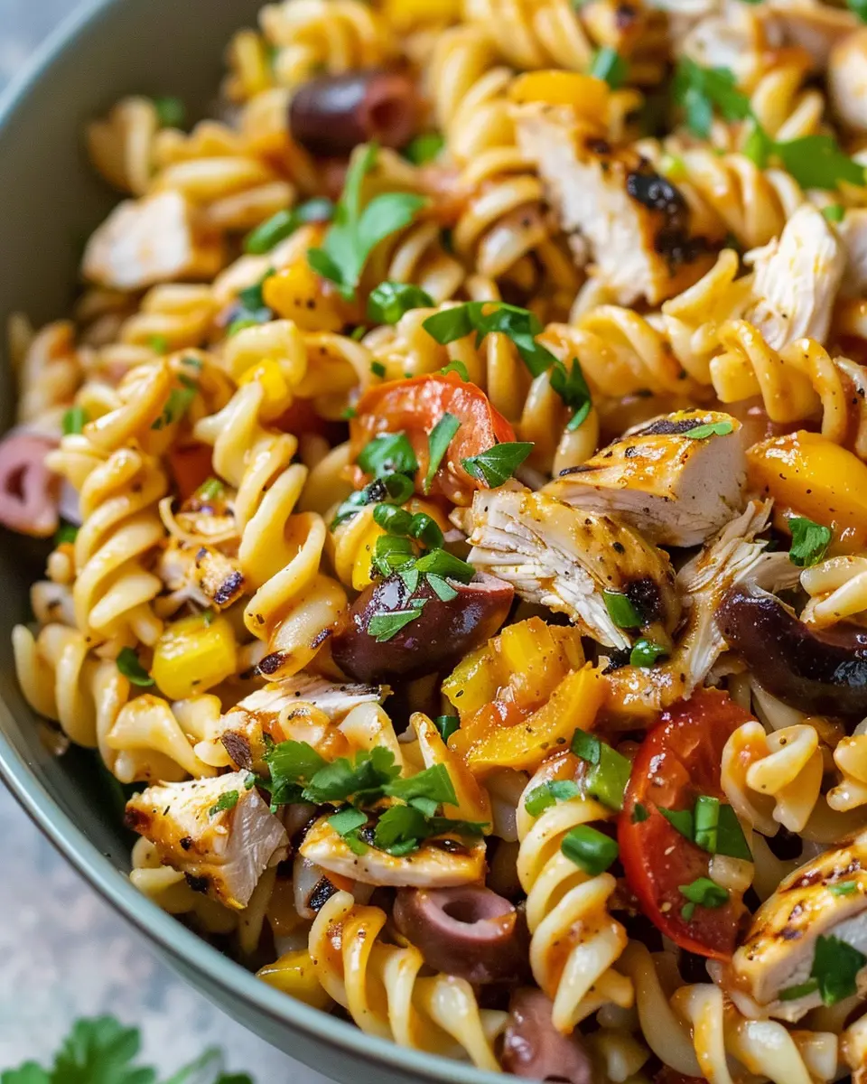 For a lighter option that brings a taste of the Mediterranean to your table, try the Mediterranean BBQ Chicken Pasta Salad. Incorporate cherry tomatoes, cucumber, black olives, and feta cheese into your pasta mix.