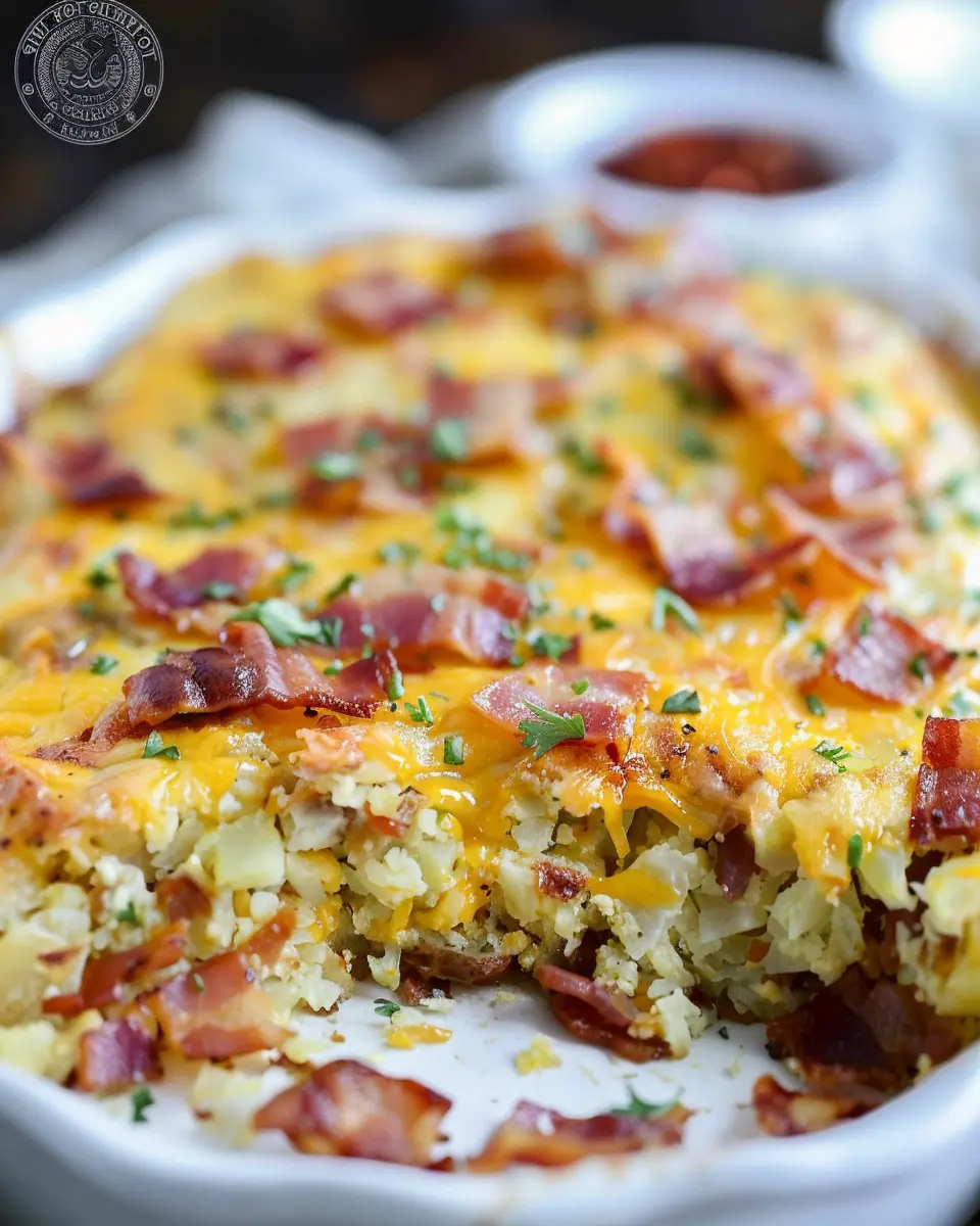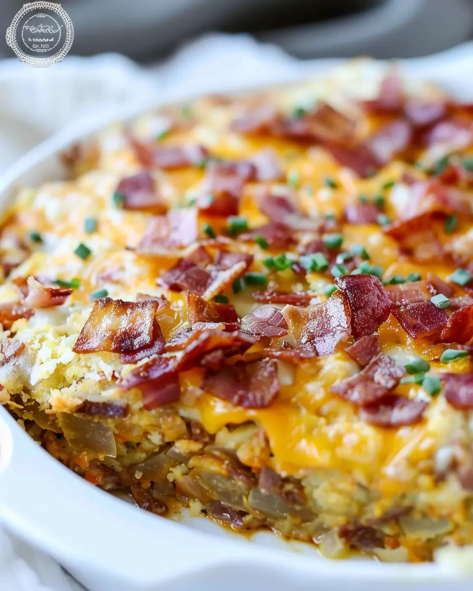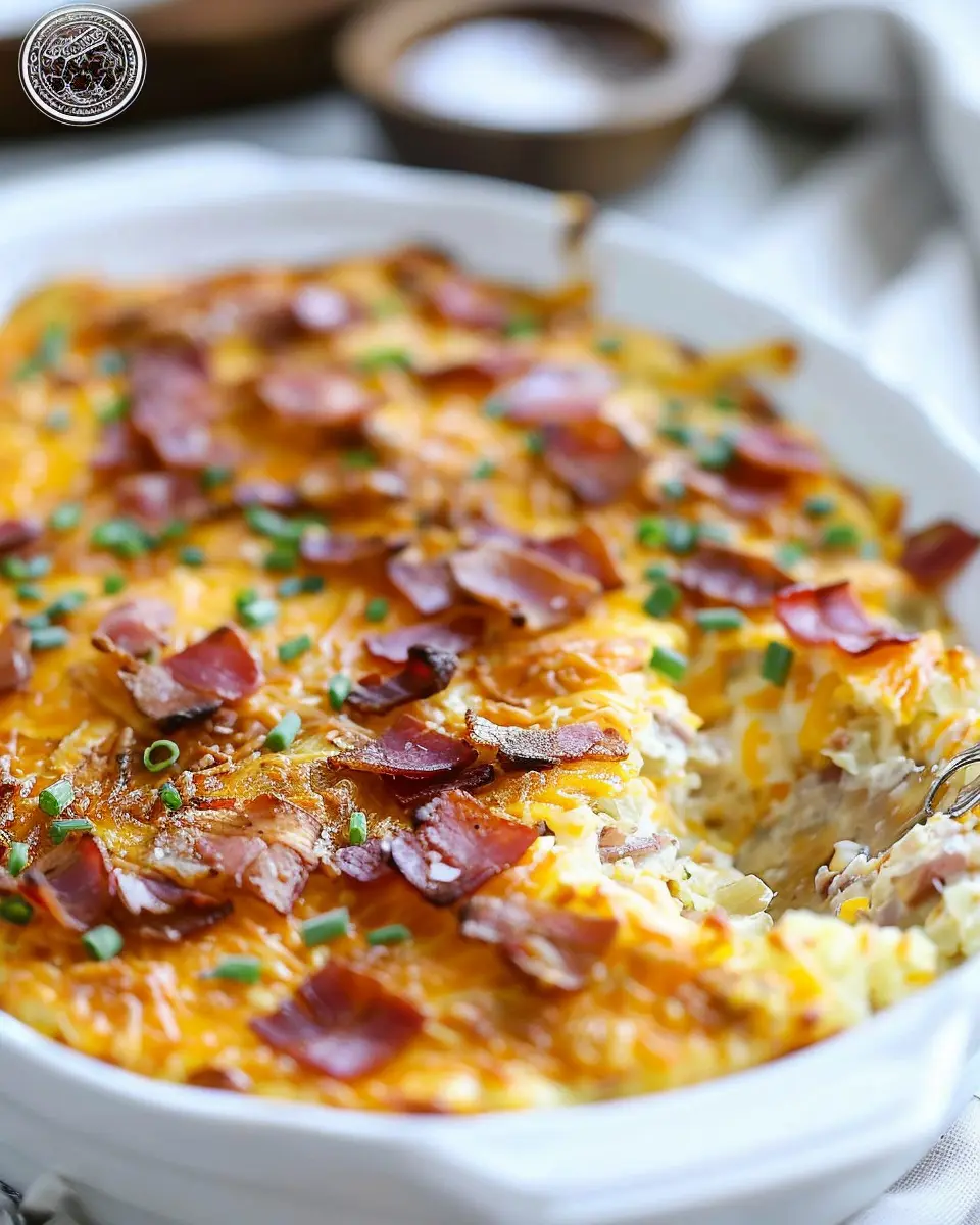 A hearty and delicious hash brown breakfast casserole featuring turkey bacon and chicken ham, perfect for a comforting breakfast idea.