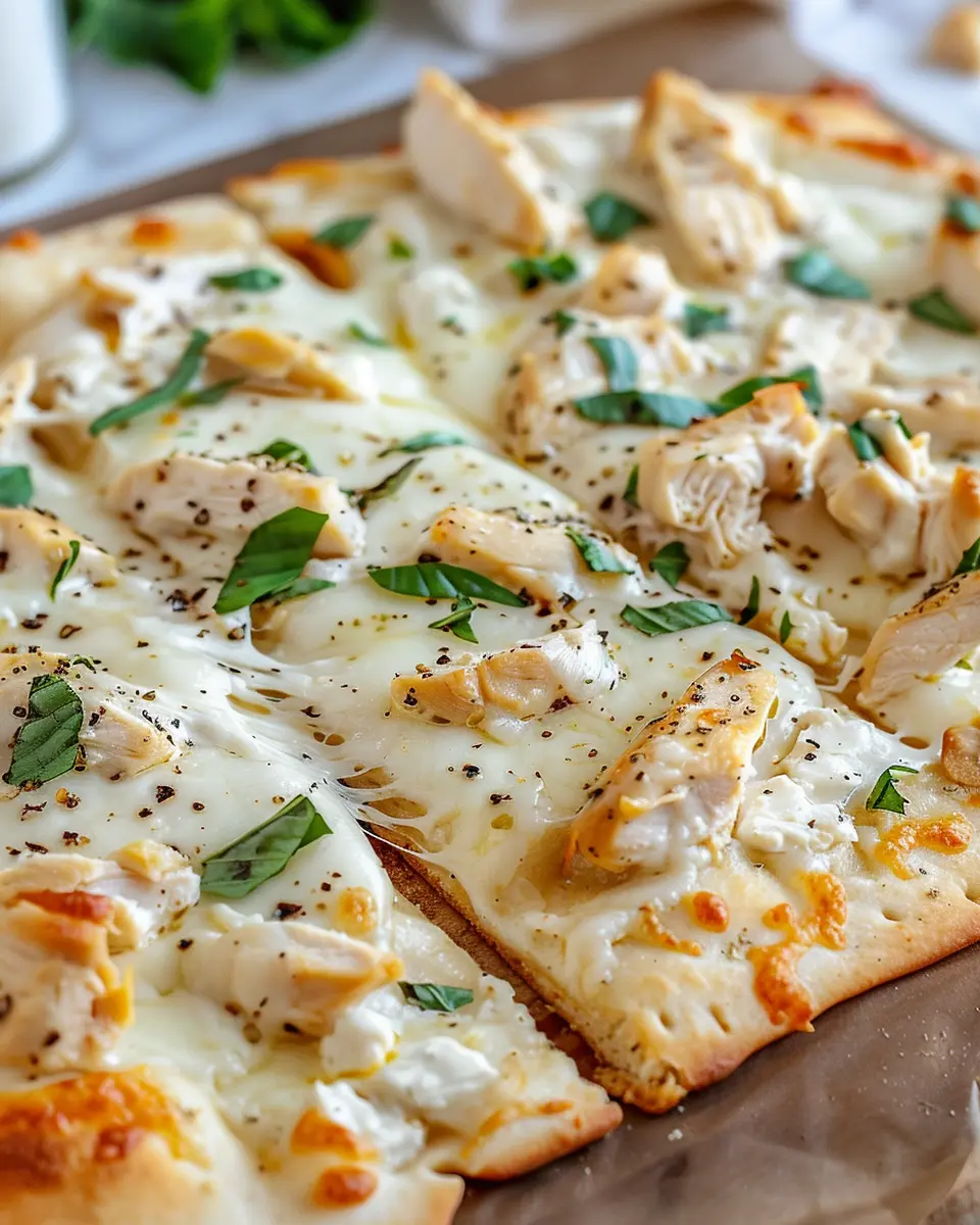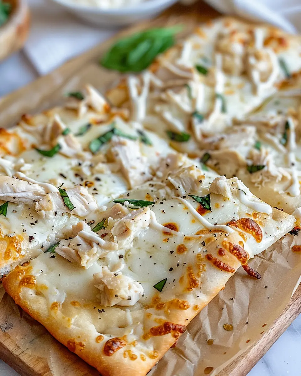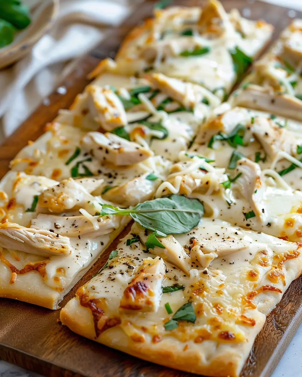 Indulge in the creamy, savory flavors of Chicken Alfredo Flatbread, a delicious homemade recipe that combines tender chicken, rich Alfredo sauce, and a crispy flatbread base.