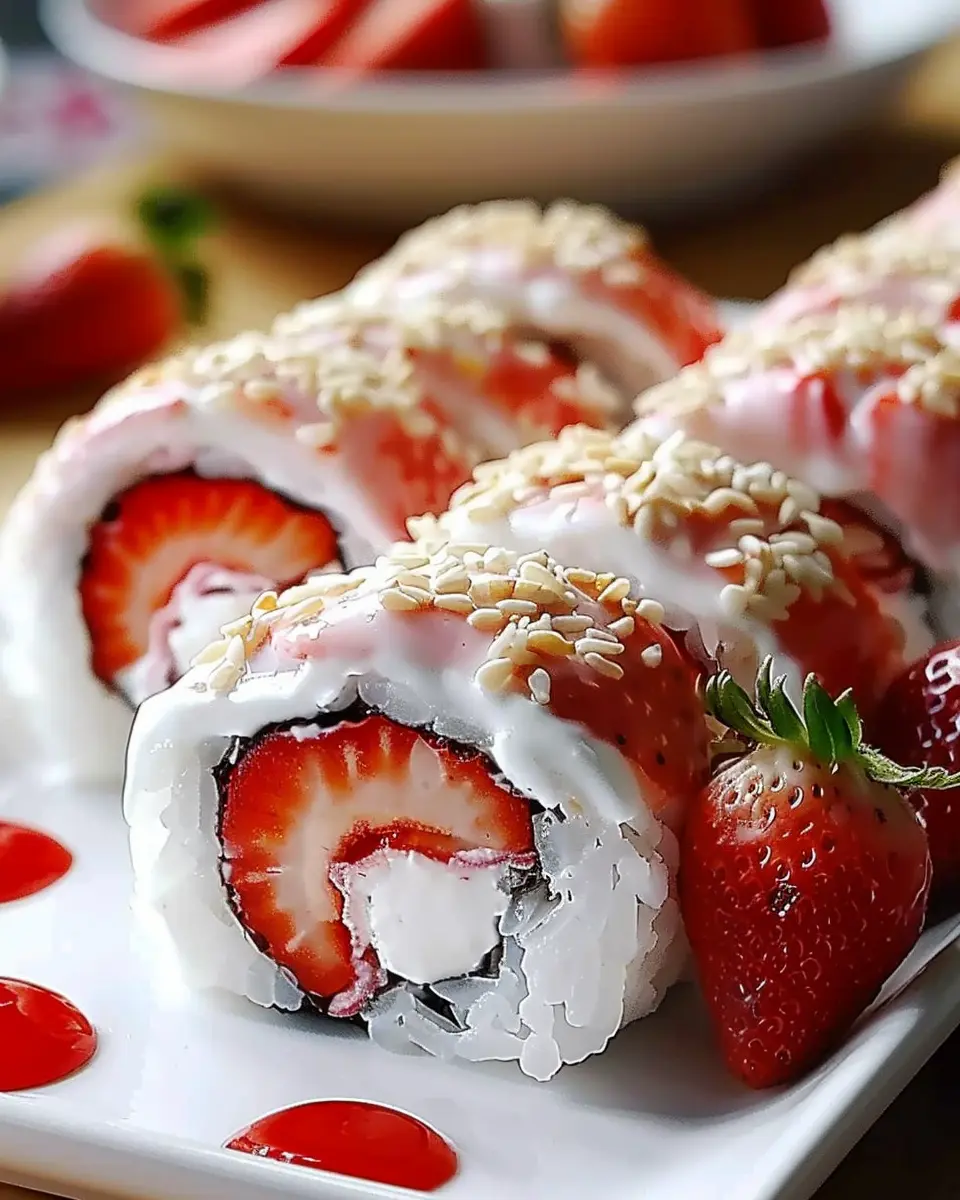 • Serve with a Fun Dip: Consider pairing your strawberry sushi rolls with a drizzle of chocolate sauce or a side of yogurt for dipping. This extra touch adds a delightful flavor contrast.