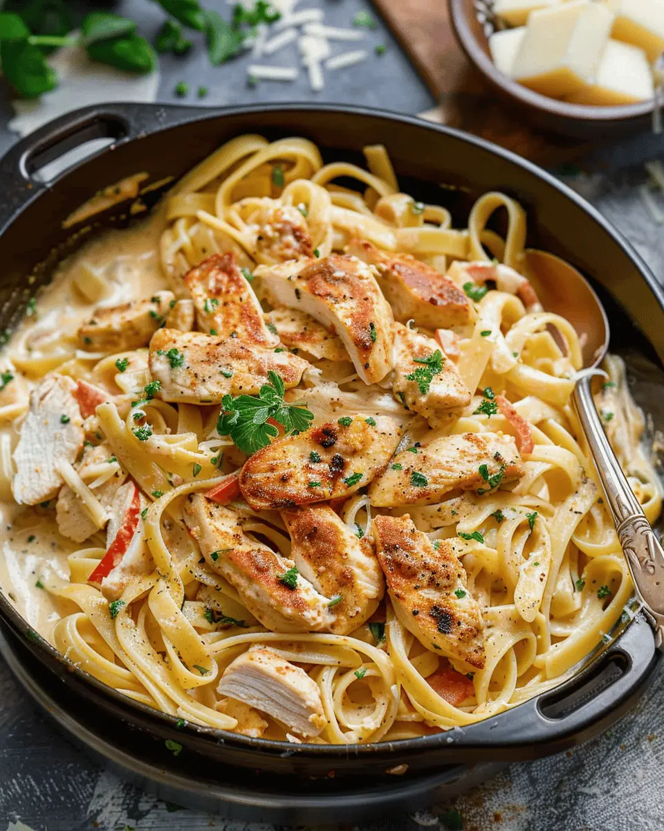 Once your pasta is al dente, drain it and toss it into your skillet with the sautéed veggies. Return the chicken to the skillet and pour in the cream. Stir everything together over low heat for a couple of minutes until the pasta is coated in that luscious sauce. Here’s where you can get creative! You could add a splash of lemon juice for brightness or even some spinach for extra nutrients.