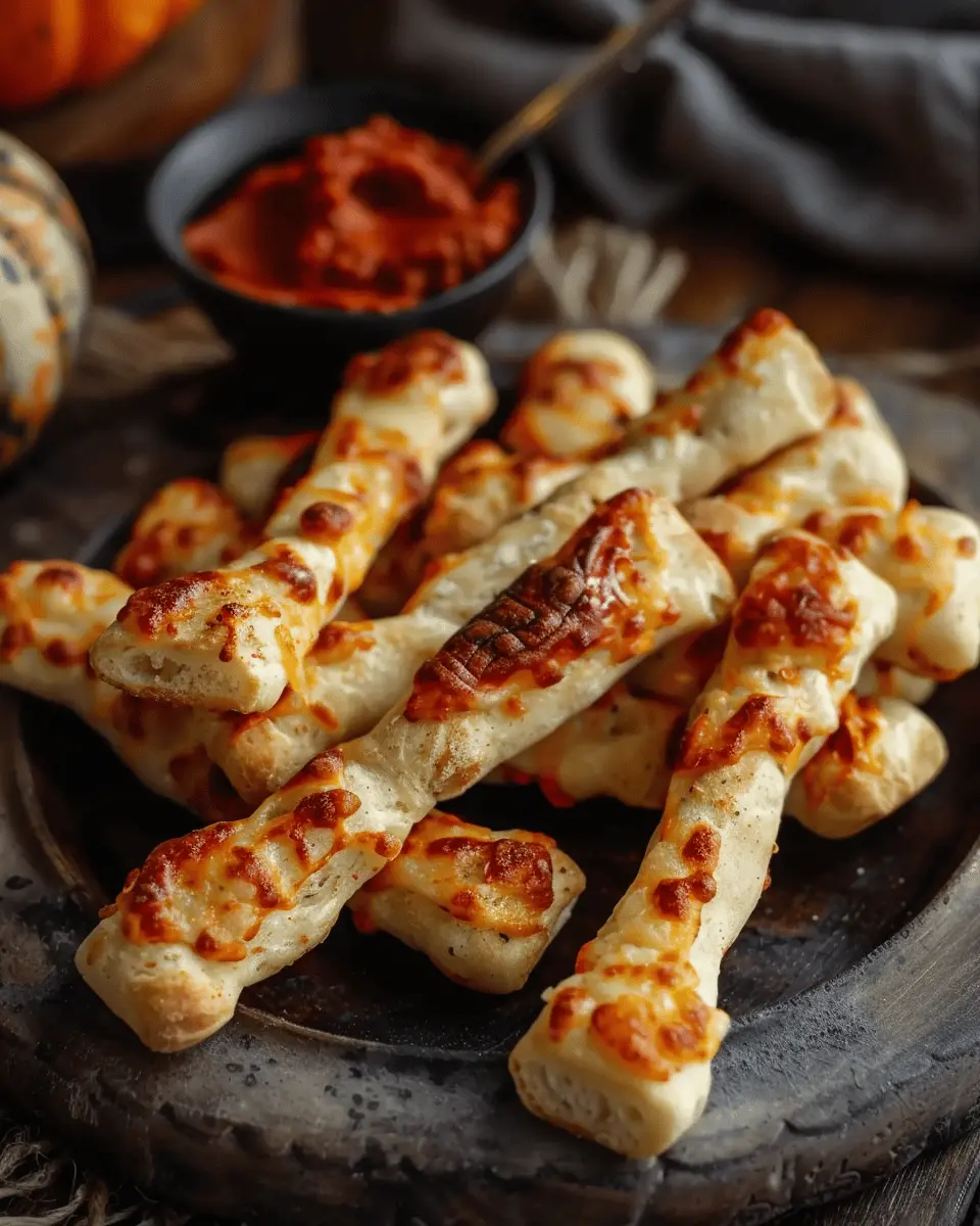 When it comes to presenting your cheesy Halloween breadstick bones, think outside the typical serving dish. Consider using a cauldron as a bowl for dipping sauce or arranging the breadsticks in a spooky skull-shaped platter. If you have a serving board, scatter some candy eyeballs around the breadsticks for an eye-catching display. You can even use a spooky tablecloth to enhance the Halloween vibe. This not only makes your appetizer visually appealing but also brings the festive spirit to the forefront.