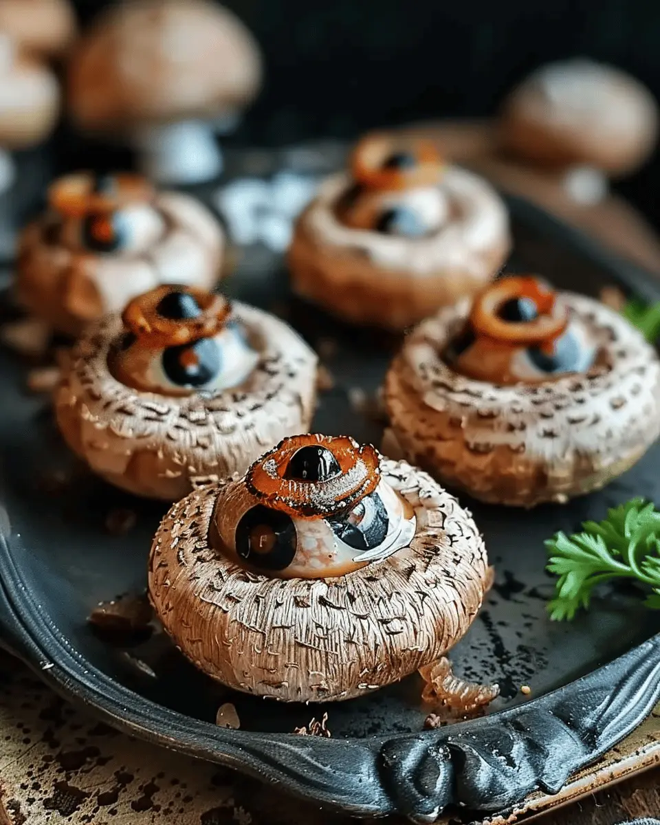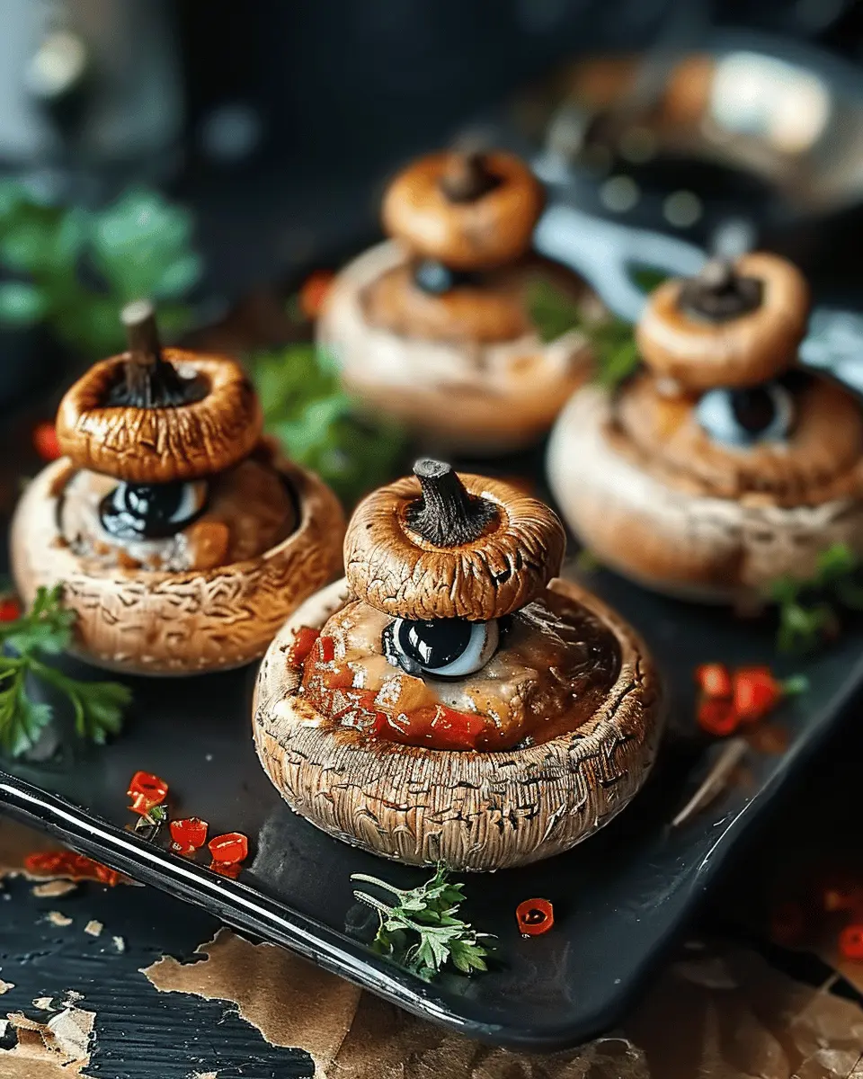 Arrange your stuffed mushroom eyeballs on a dark, eerie plate. Add some fresh herbs or leafy greens around them for a pop of color. Think of garnishes like black olives or sliced cherry tomatoes to create more eyeball “pupils.”