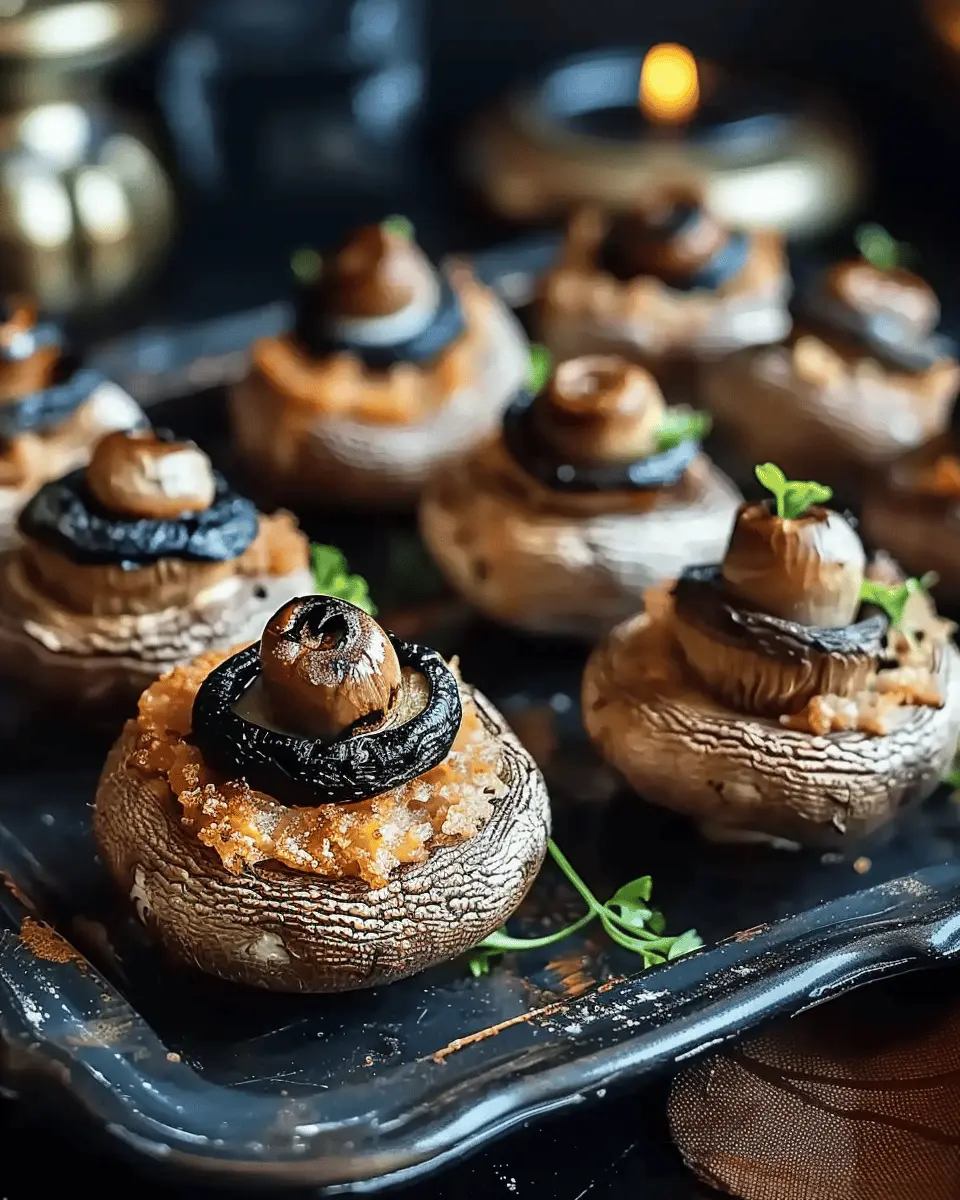 Finally, it’s time to showcase your spooky snacks! Create a visually appealing platter by arranging your stuffed mushrooms alongside other Halloween-themed treats.