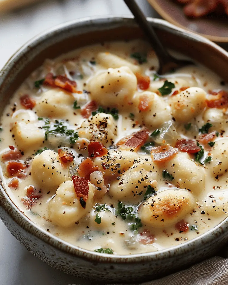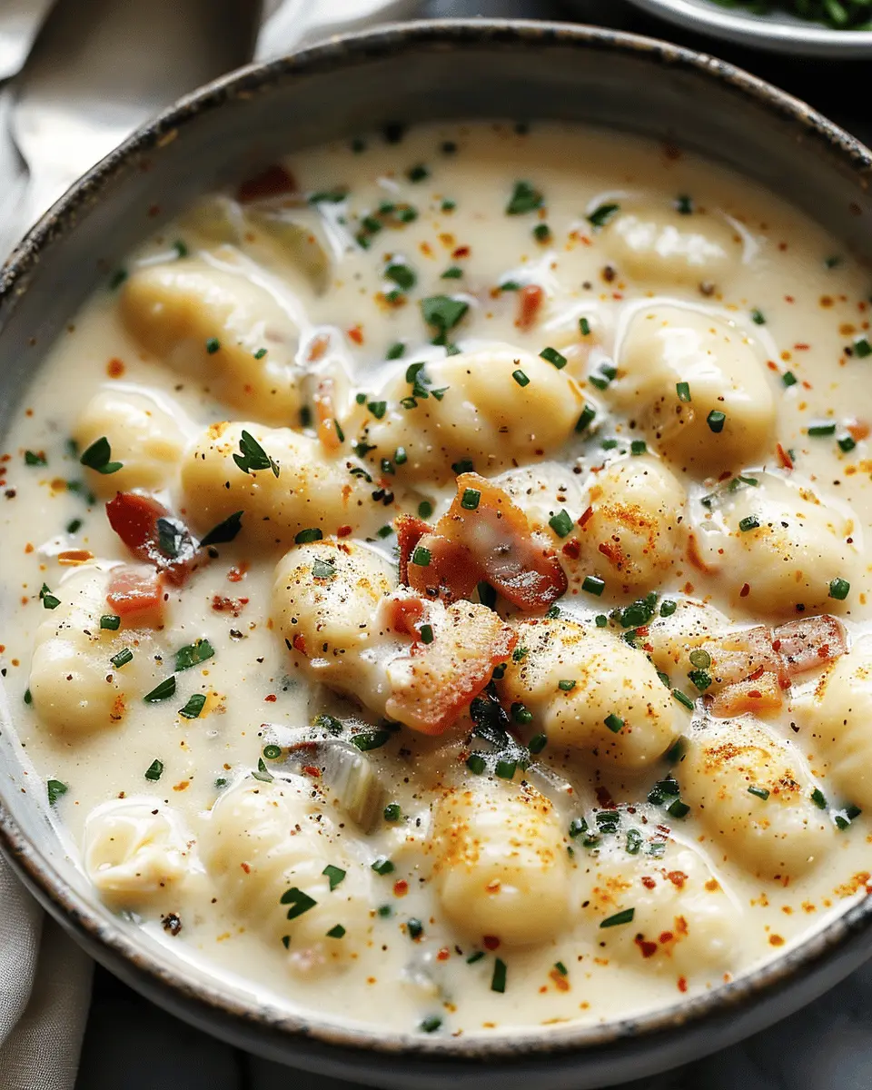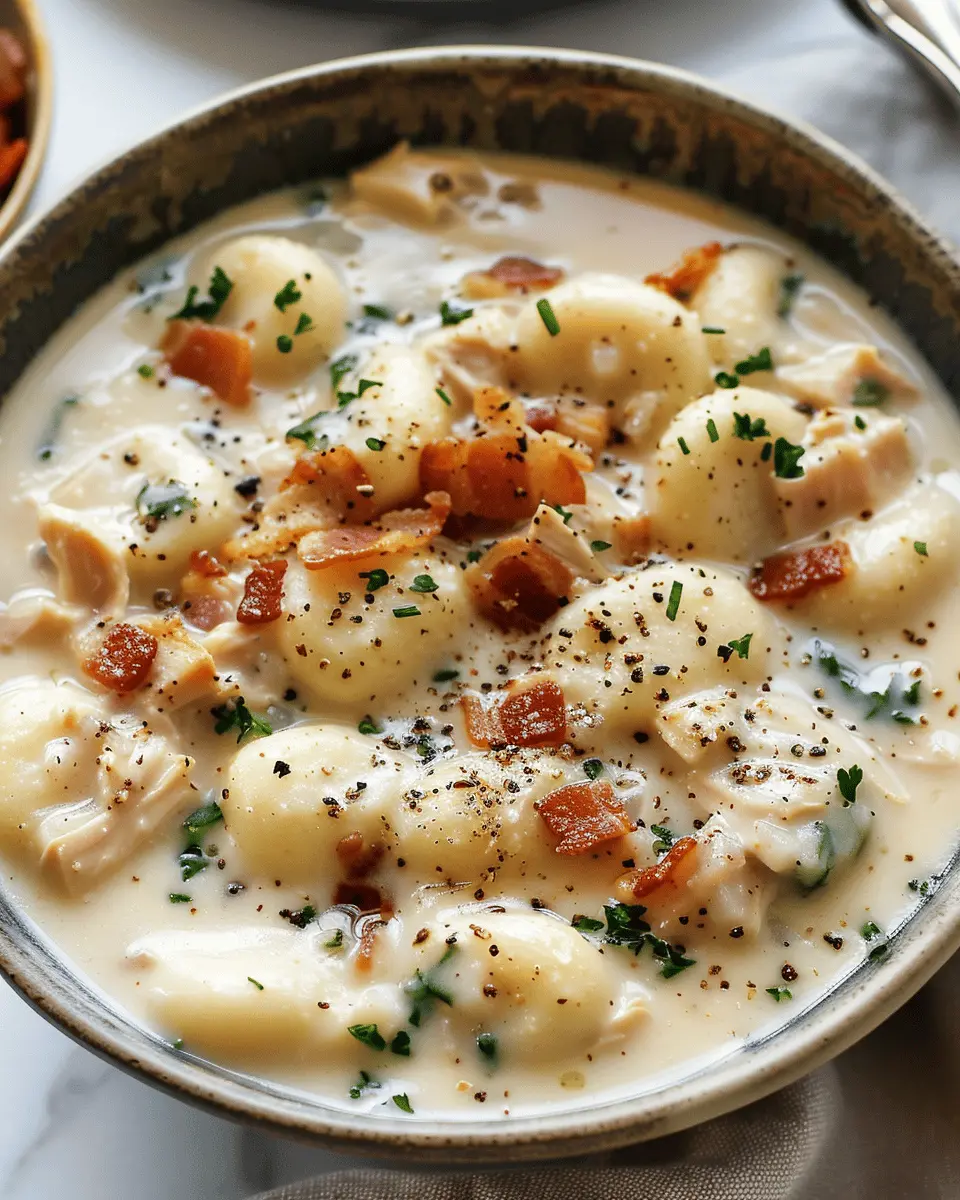 This creamy chicken and bacon gnocchi soup is indulgent and perfect for a warm meal. It’s easy to prepare and packed with flavor.