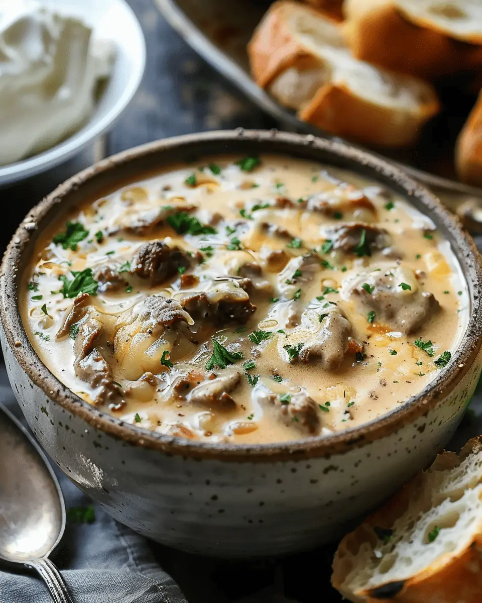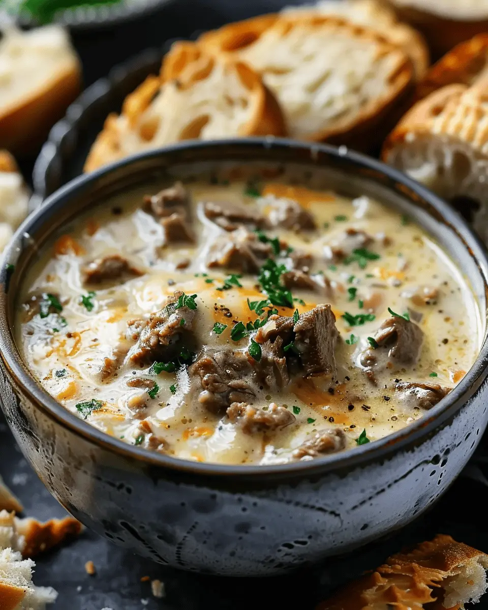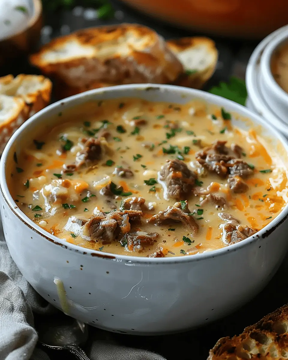 The Philly Cheese Steak Soup is a comforting and indulgent dish that combines the flavors of a classic cheese steak sandwich into a warm, hearty soup.