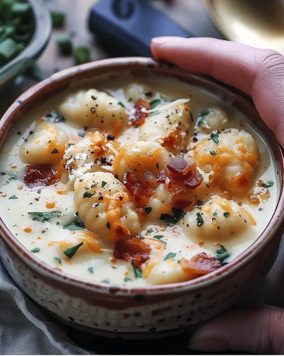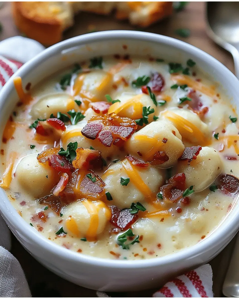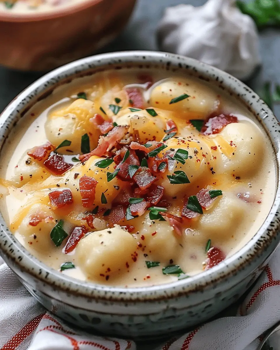 A creamy and rich soup that combines the delightful flavors of bacon, cheddar, and gnocchi for a comforting meal.
