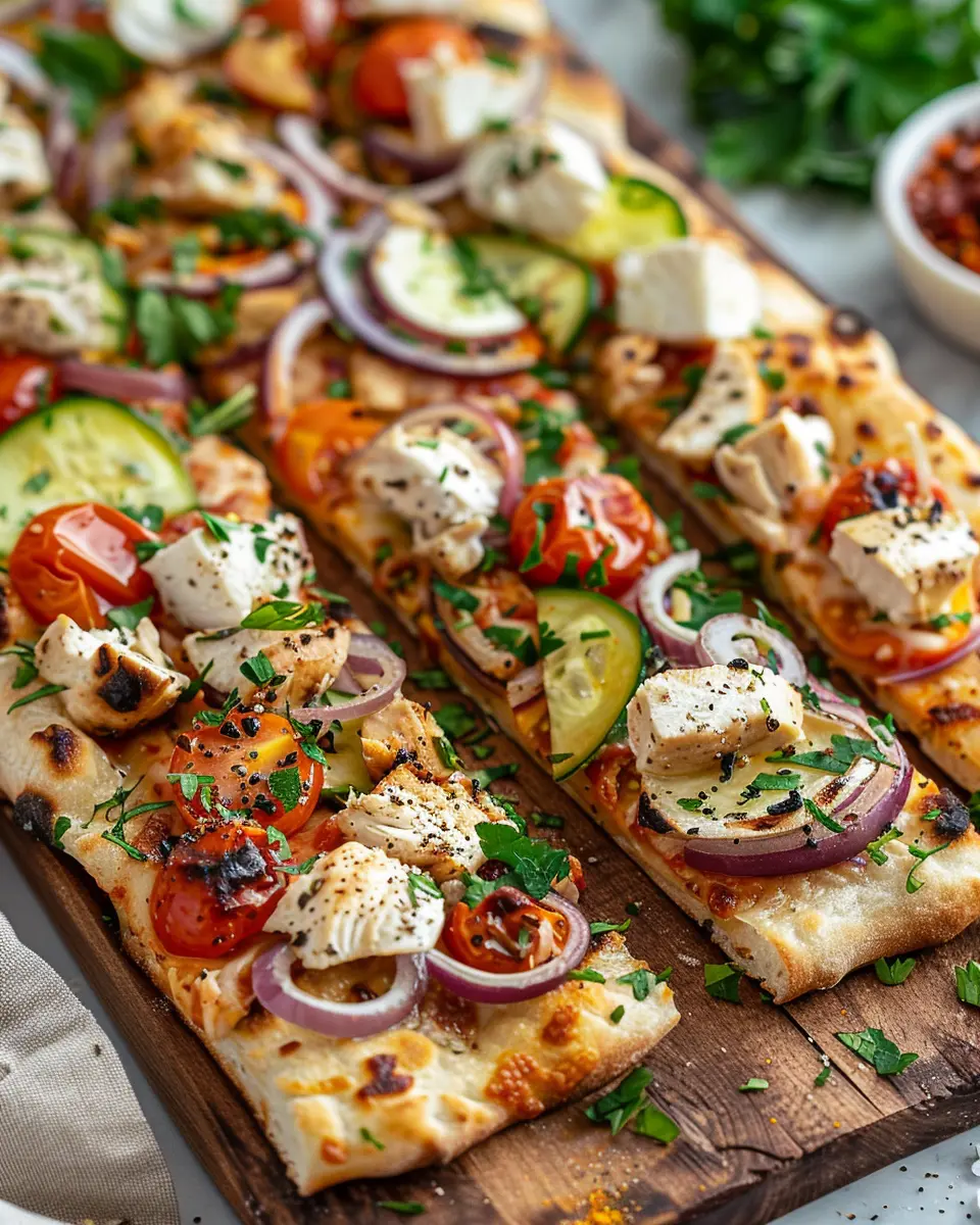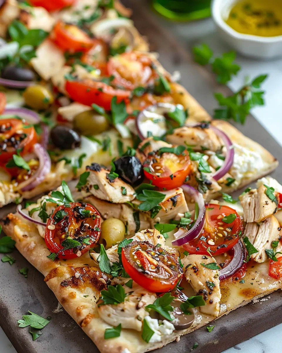 If you’re craving that classic Greek flair, why not give your Mediterranean Chicken Flatbread a makeover? Start with a base of creamy tzatziki sauce instead of the usual spread. Layer on some marinated grilled chicken, and then pile on diced cucumbers, cherry tomatoes, red onions, and a generous sprinkle of feta cheese. For an extra touch, add Kalamata olives and a dash of oregano. This version brings the sunny flavors of Greece right to your table and is perfect for a casual dinner with friends or a laid-back weekend lunch.