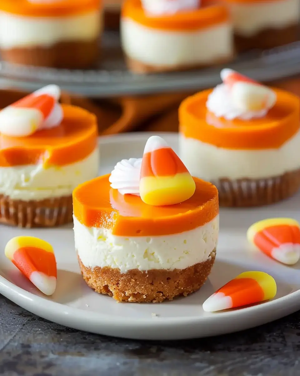 When it comes to serving mini candy corn cheesecakes, presentation is everything. Consider using individual glass jars instead of traditional plates for a fun, rustic feel. Layer the cheesecakes with crushed graham crackers at the bottom and top with whipped cream and a sprinkle of candy corn for a pop of color.