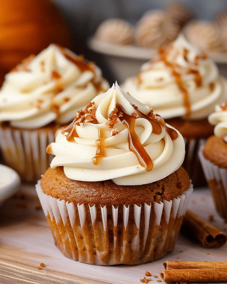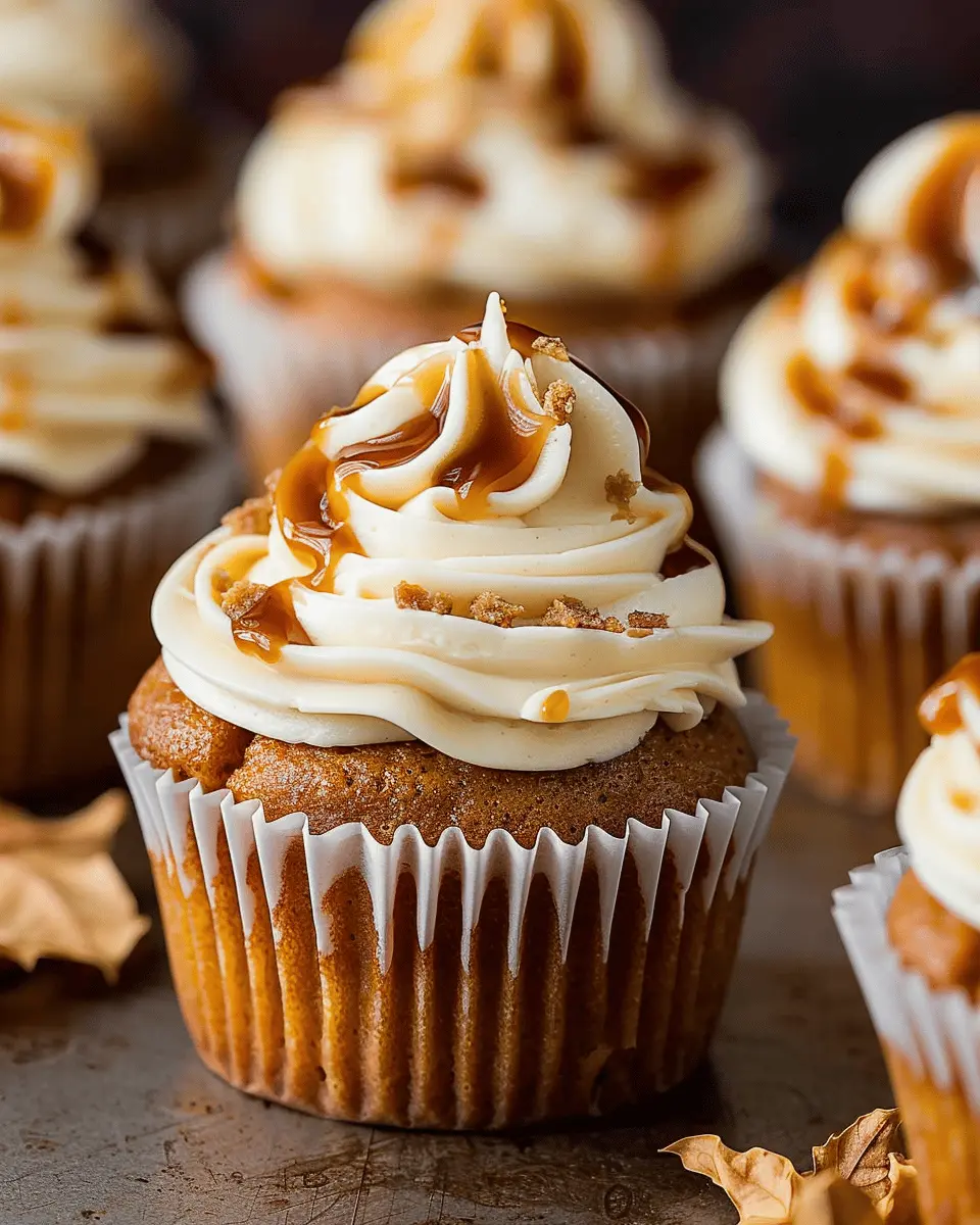 Indulge in the warm flavors of fall with these delightful pumpkin cupcakes topped with a rich salted caramel cream cheese frosting.