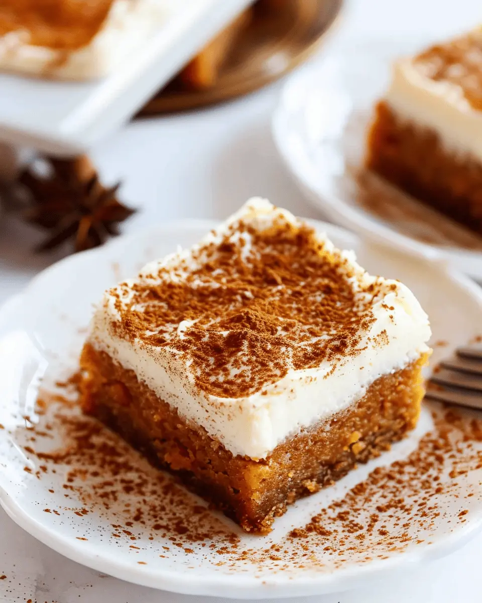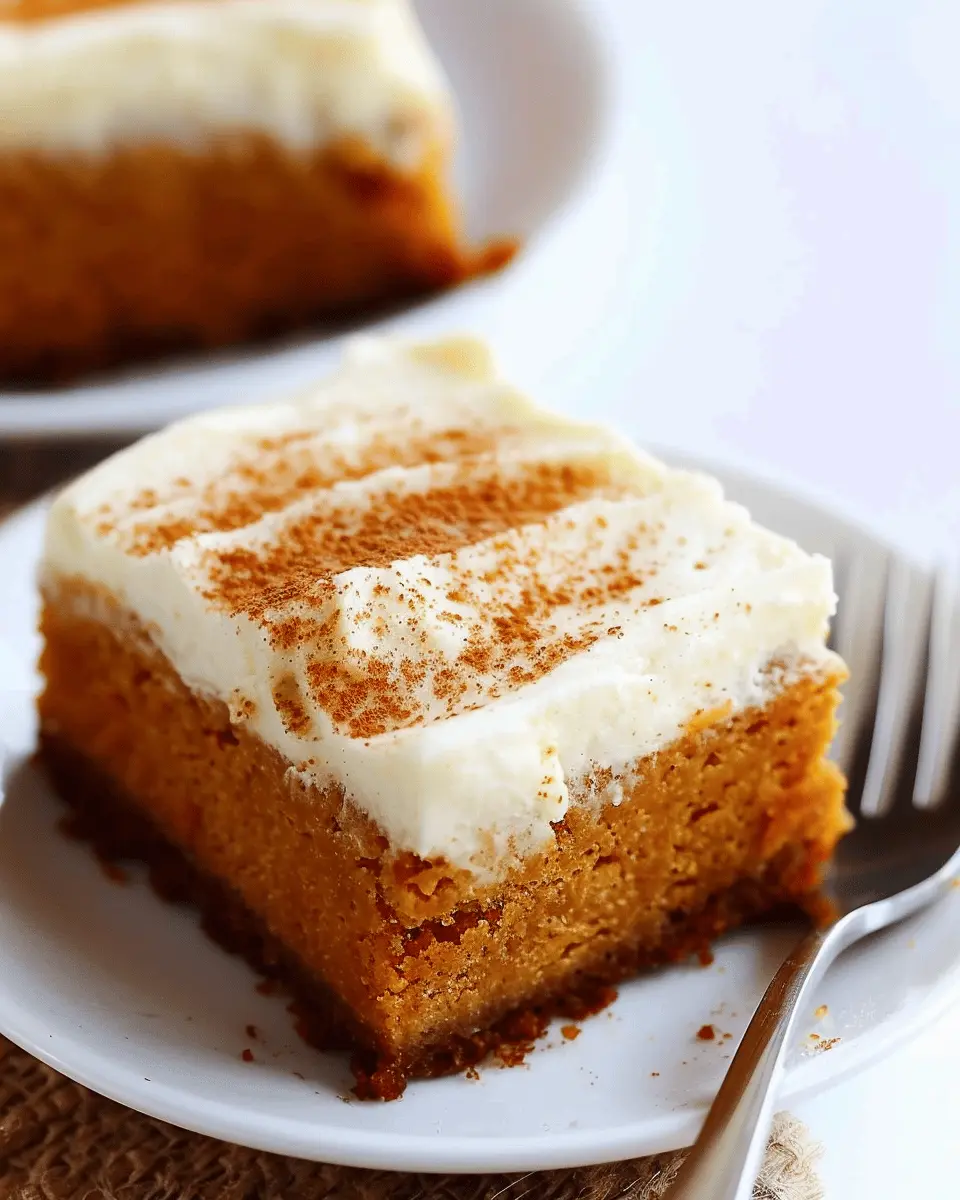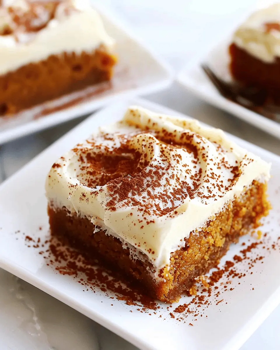 These pumpkin bars are perfectly moist and topped with a creamy frosting that makes them irresistible. Perfect for any occasion!