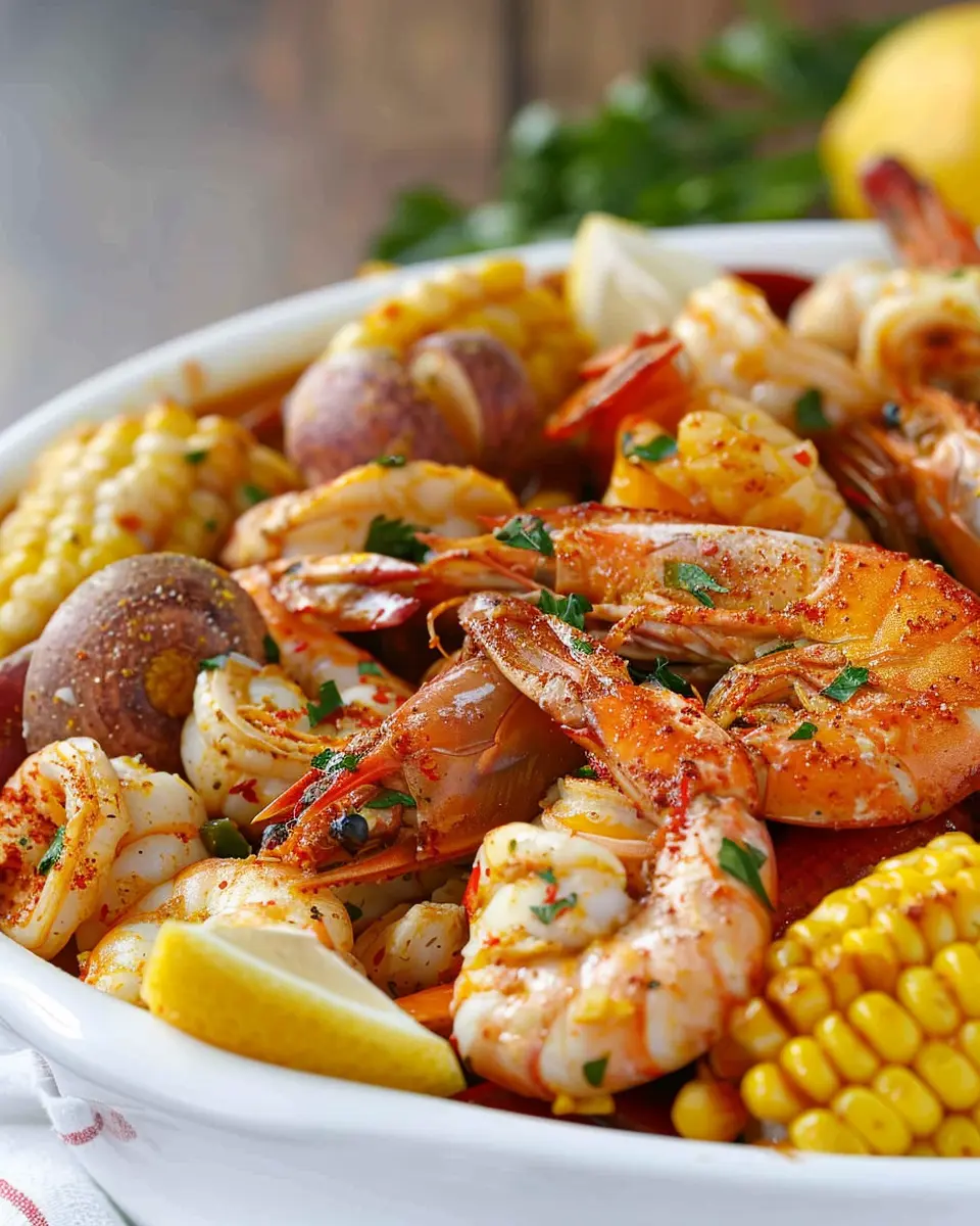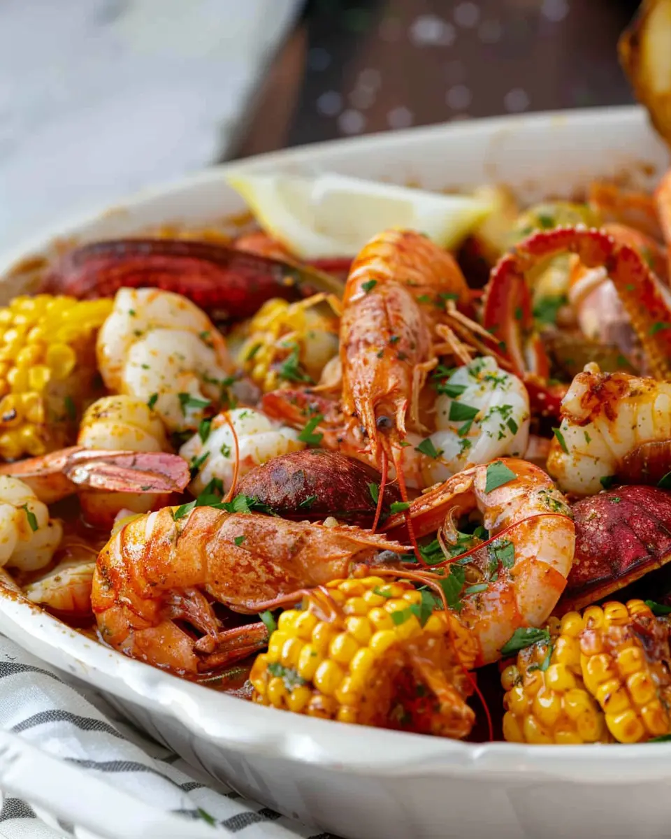 - Vegetables: Red potatoes and corn on the cob soak up the buttery goodness.