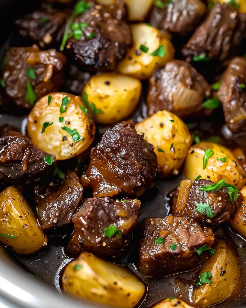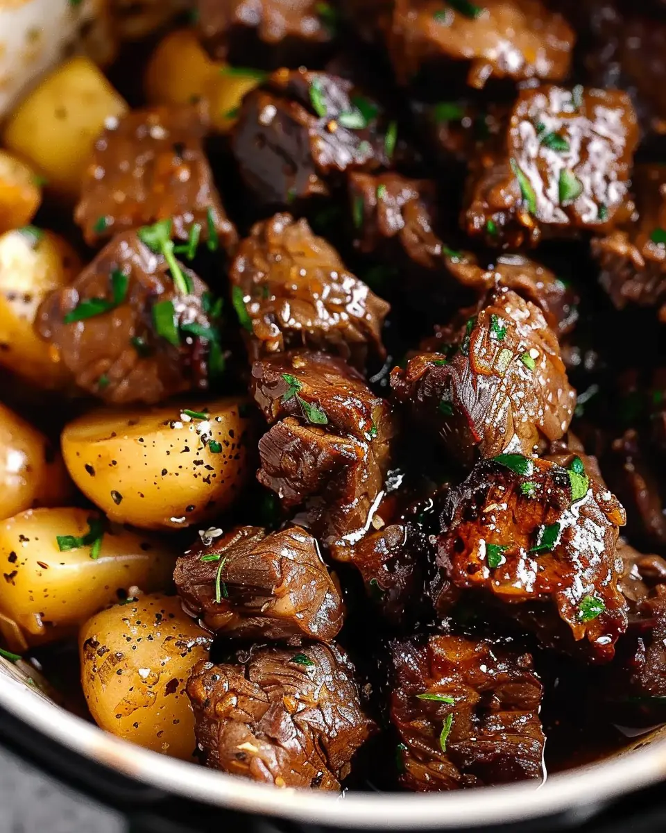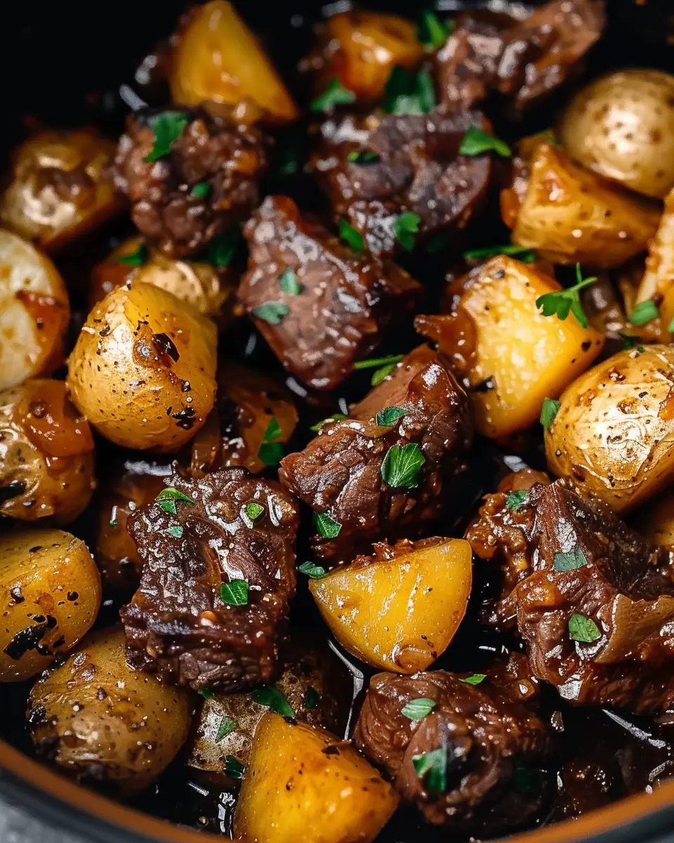 Succulent beef bites cooked in a rich garlic butter sauce, paired with tender potatoes for a comforting meal.