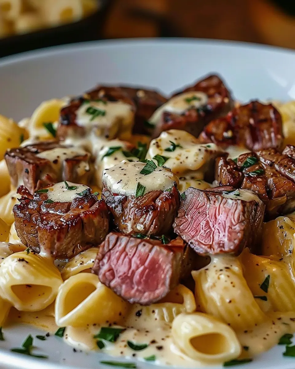 Steak Bites and Shell Pasta in Garlic Butter Alfredo Sauce
