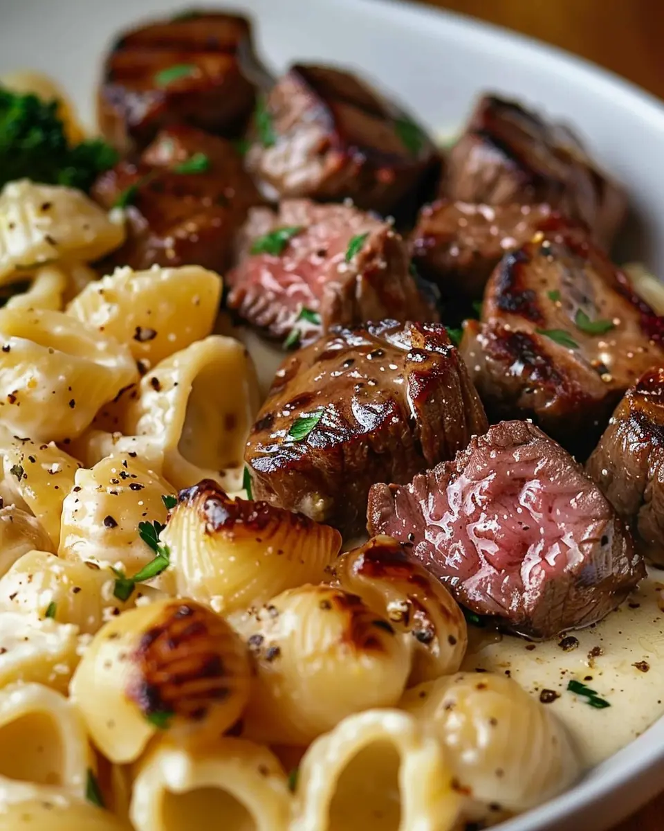 Keywords: Steak Bites, Shell Pasta, Garlic Butter, Alfredo Sauce