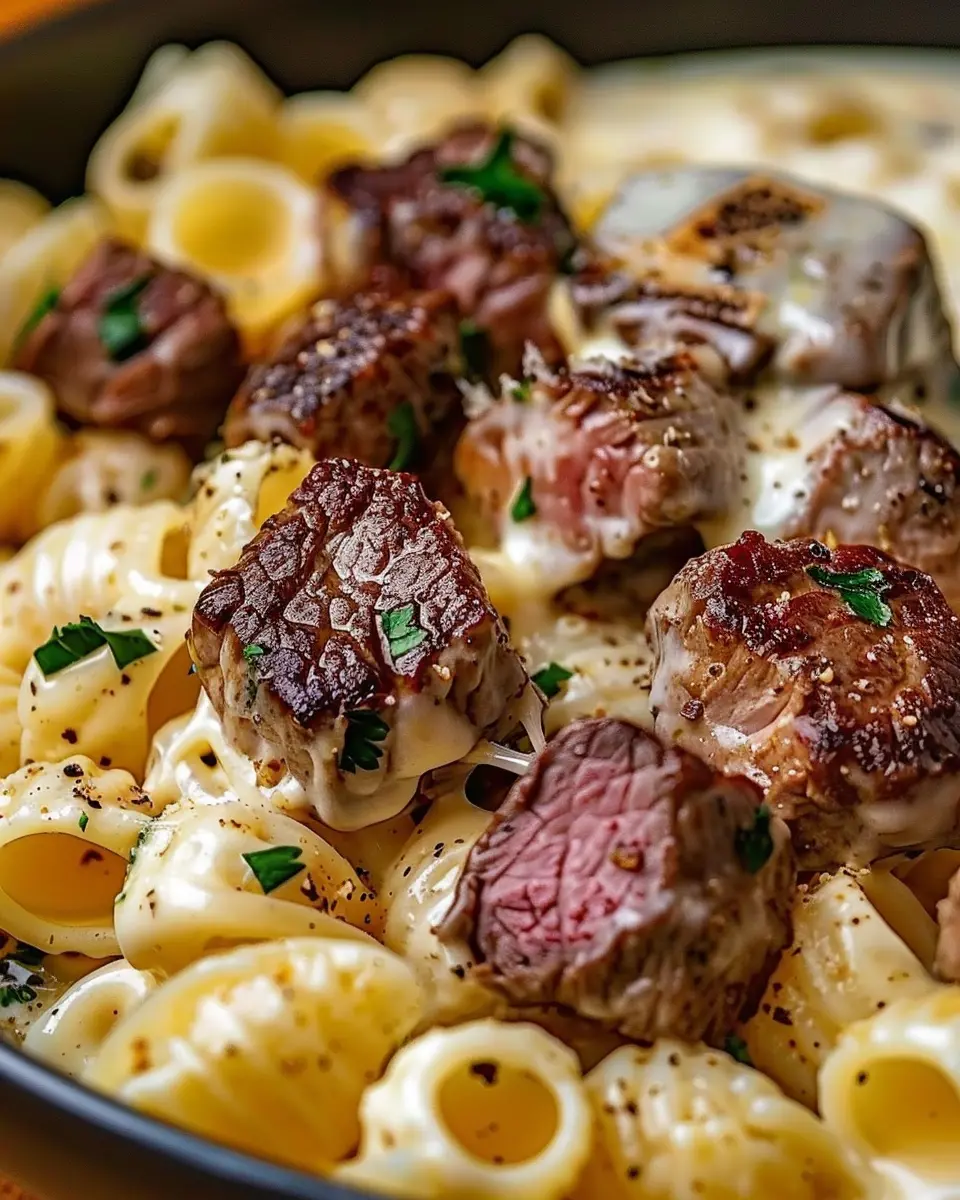Steak Bites and Shell Pasta in Creamy Garlic Butter Alfredo Sauce