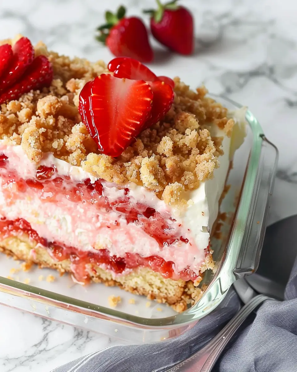 If you find yourself with extra strawberry crunch poke cake, lucky you! Store it in an airtight container in your fridge, and it should last about 3 to 5 days. Just remember that the crunch may soften over time, so enjoy it while it’s fresh for the best experience.