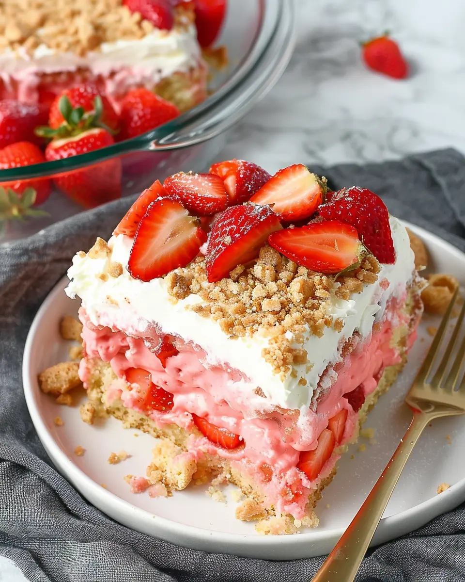 Perfect for Gatherings: The strawberry crunch poke cake is a crowd-pleaser, perfect for parties, office potlucks, or just a sweet way to enjoy your weekend with friends. It’s guaranteed to be a hit!