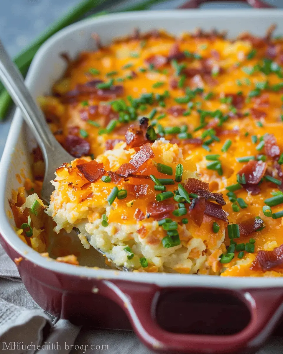 Finally, once your sweet potatoes are cooked and flavored, it’s time to assemble your Loaded Twice Baked Potato Casserole. Mix the sweet potato mash with your chicken ham and turkey bacon, then spread everything into a baking dish. Top it generously with cheese, chives, and maybe even a dollop of sour cream if you’re feeling indulgent.